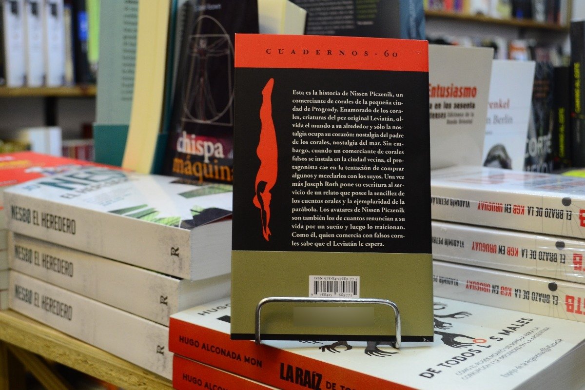 Esta es la historia de Nissen Piczenik, un comerciante de corales de la pequeña ciudad de Progrody. Enamorado de los corales, criaturas del pez original Leviatán, olvida el mundo a su alrededor y sólo la nostalgia ocupa su corazón: nostalgia del padre de los corales, nostalgia del mar. Sin embargo, cuando un comerciante de corales falsos se instala en la ciudad vecina, el protagonista cae en la tentación de comprar algunos y mezclarlos con los suyos. Una vez más Joseph Roth pone su escritura al servicio de un relato que posee la sencillez de los cuentos orales y la ejemplaridad de la parábola. Los avatares de Nissen Piczenik son también los de cuantos renuncian a su vida por un sueño y luego lo traicionan. Como él, quien comercia con falsos corales sabe que el Leviatán le espera.
