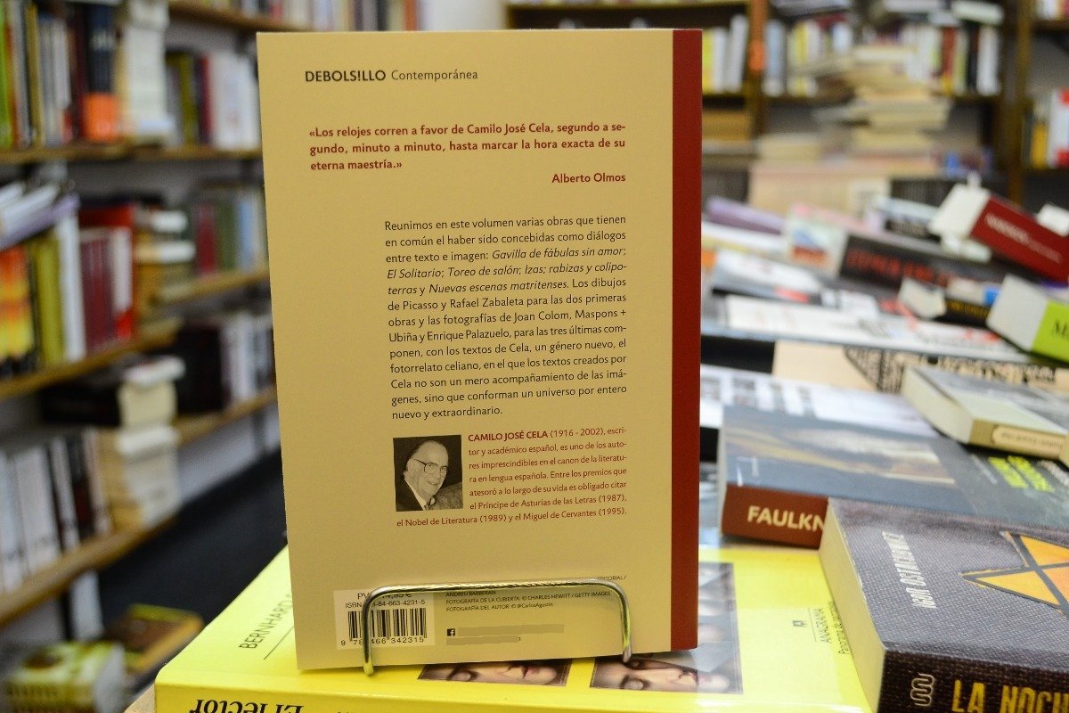 Reunimos en este volumen varias obras que tienen en común el haber sido concebidas como diálogos entre texto e imagen: Gavilla defábulas sin amor, El solitario, Toreo de salón, Izas, rabizas y colipoterras y Nuevas escenas matritenses. Los dibujos de Picasso y Rafael Zabaleta para las dos primeras obras y las fotografías de Joan Colom, Maspons + Ubiña y Enrique Palazuelo, para las tres últimas componen, con los textos de Cela, un género nuevo, el fotorrelato celiano, en el que los textos creados por Cela no son un mero acompañamiento de las imágenes, sino que conforman un universo por entero nuevo y extraordinario.