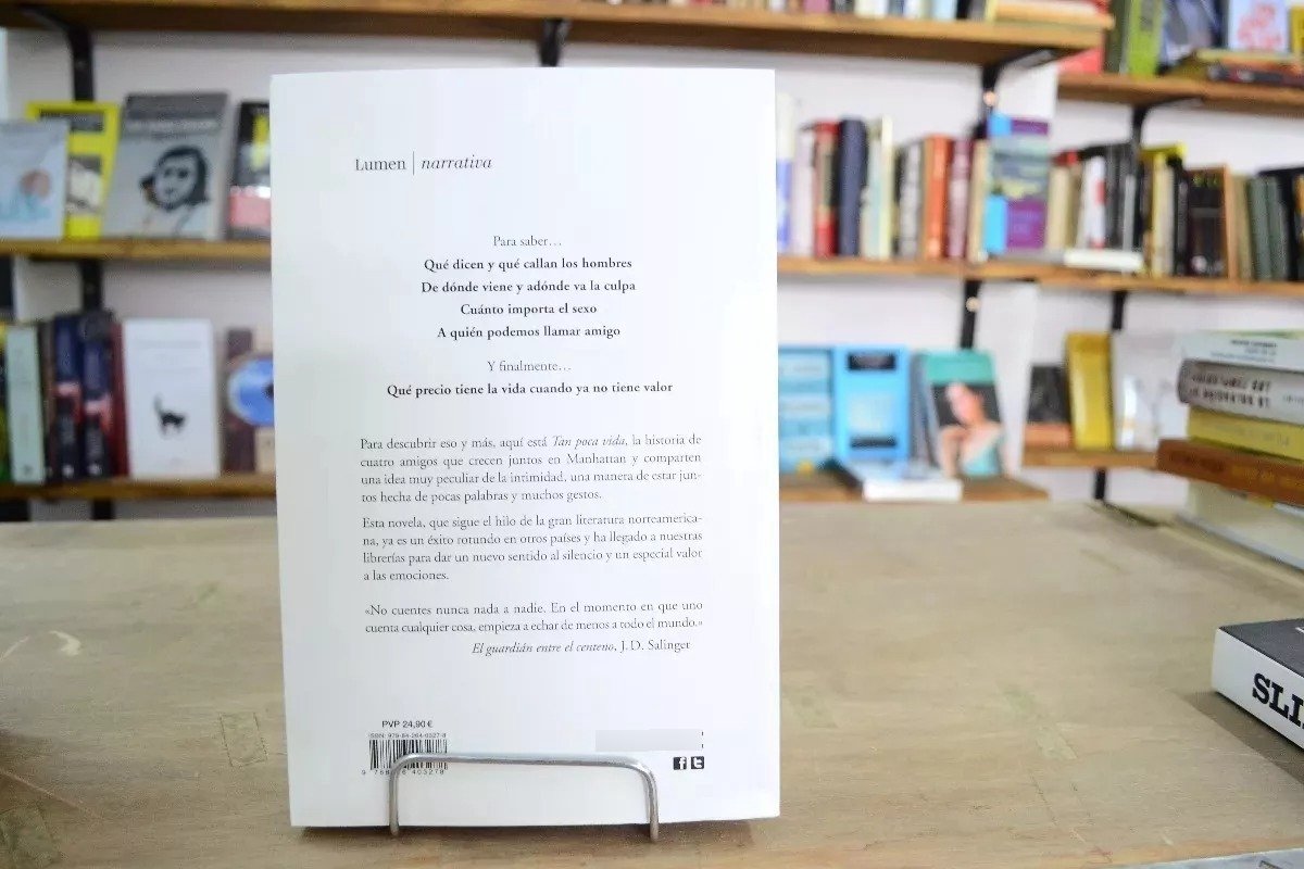 Para descubrir eso y más, aquí está Tan poca vida, una historia que recorre más de tres décadas de amistad en la vida de cuatro hombres que crecen juntos en Manhattan. Cuatro hombres que tienen que sobrevivir al fracaso y al éxito y que, a lo largo de los años, aprenden a sobreponerse a las crisis económicas, sociales y emocionales. Cuatro hombres que comparten una idea muy peculiar de la intimidad, una manera de estar juntos hecha de pocas palabras y muchos gestos. Cuatro hombres cuya relación la autora utiliza para realizar una minuciosa indagación de los límites de la naturaleza humana.